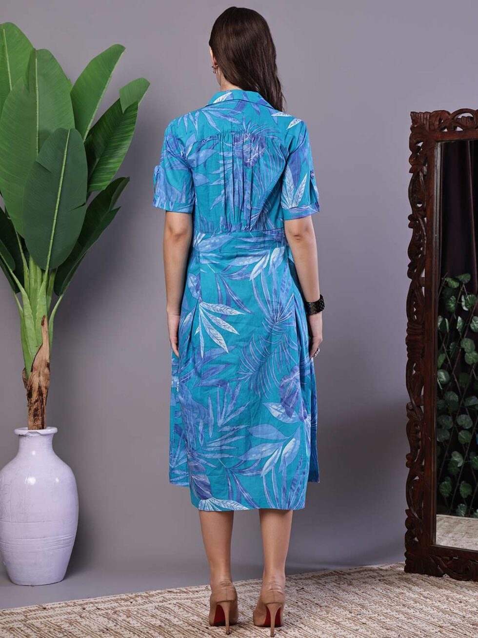 Women’s Blue Floral Cotton Pleated Midi Dress with Collar