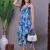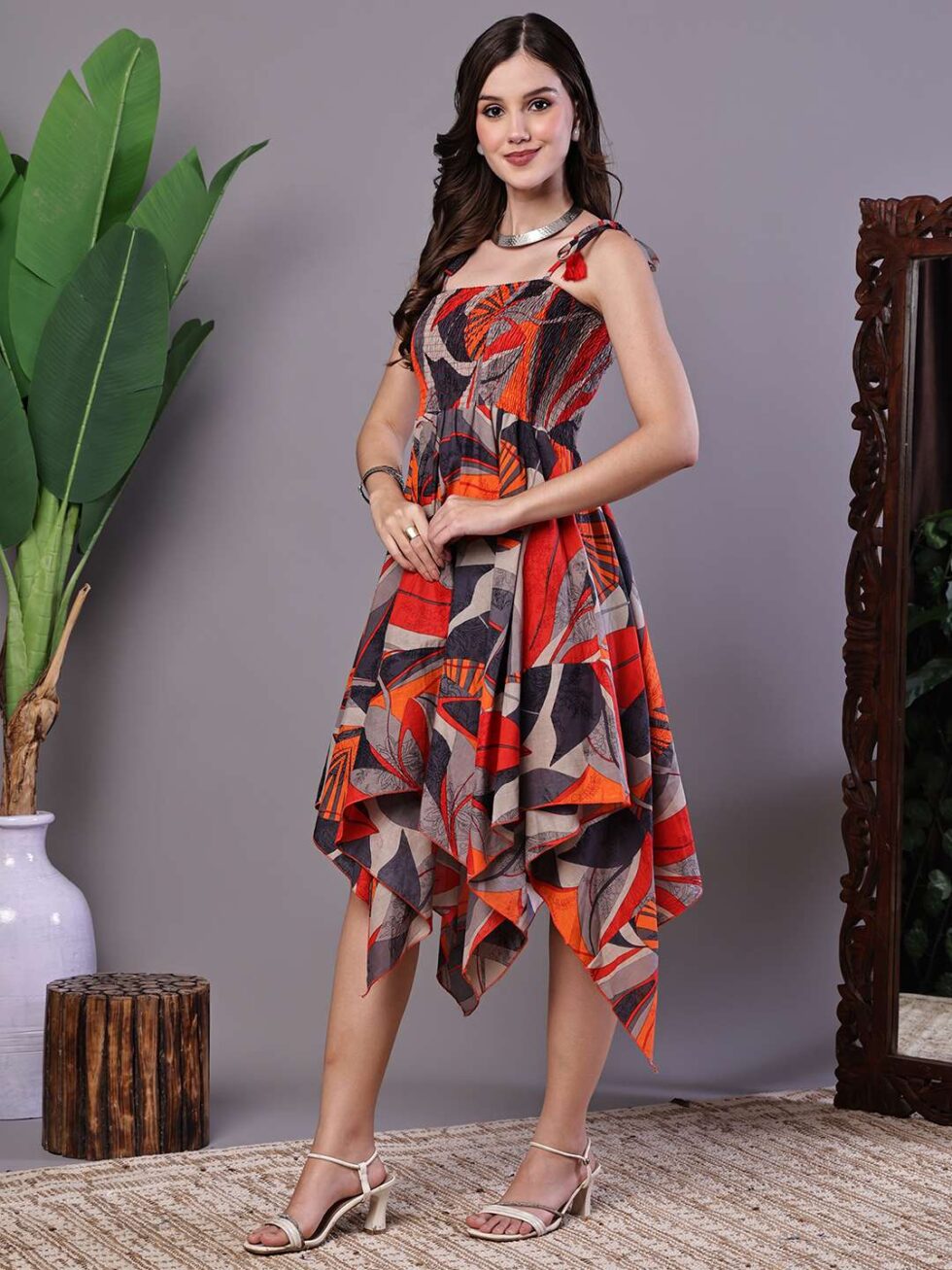 Effortlessly stylish dress with a vibrant abstract print, tie-up shoulder straps, and a chic high-low handkerchief hemline ? perfect for casual days or evening gatherings.