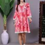 Wome’s Pink Floral Printed Cotton A-Line Dress with Embroidered Yoke Midi Dresses